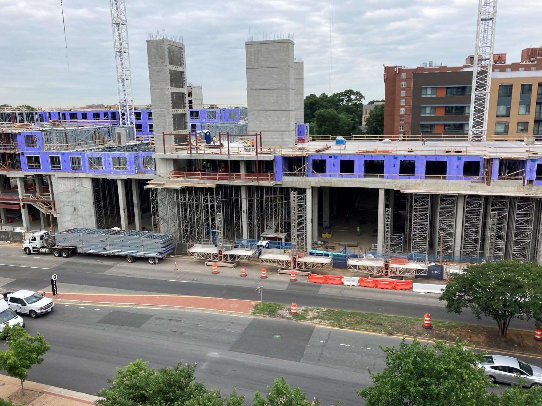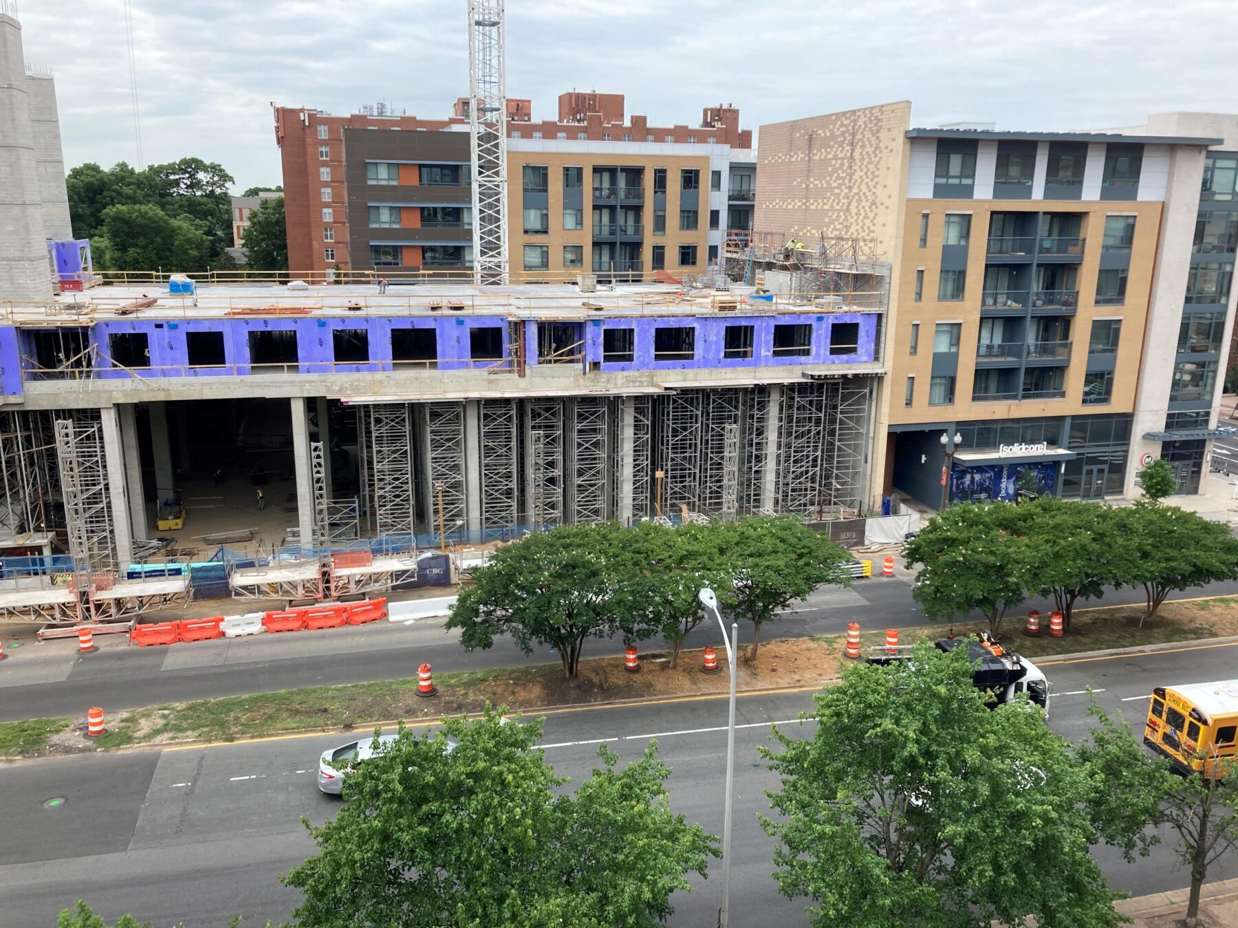 Concrete podium with six levels of slab on metal deck. The podium consists of two below grade parking garages, a new Harris Teeter grocery space at grade and the slabs on metal decks consisting of 310 apartment units.